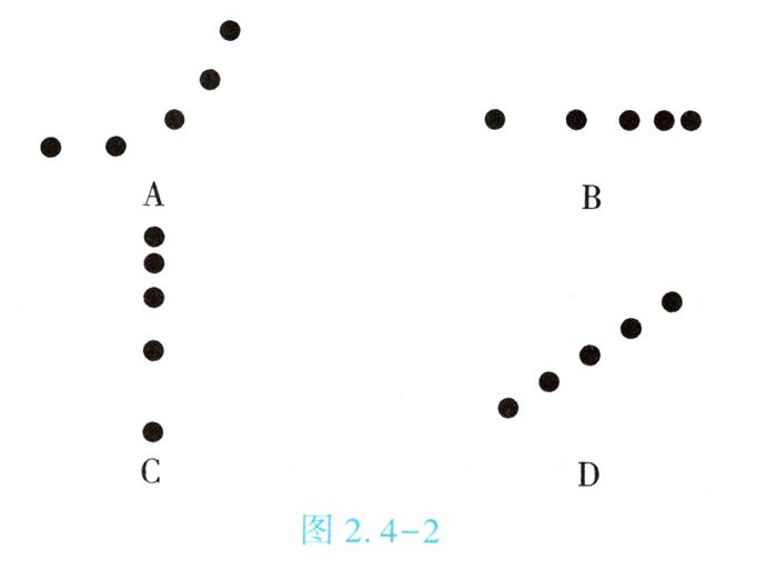1. (★★)图 2.4 - 2 A、B、C、D 所示的分别是用照相机拍摄(每 0.1 s 拍摄一次)的小球在四种不同运动状态下的照片,其中小球做匀速直线运动的是【
