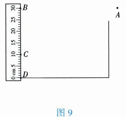 16. (2023·潍坊)为测量容器中水的深度,一同学将刻度尺竖直插入水中,如图 9 所示。从 A 处向水中看去,看到刻度尺上 B 点在水中所成的像位于 C 点,同时看到水中 D 点的像也位于 C 点。请据此: