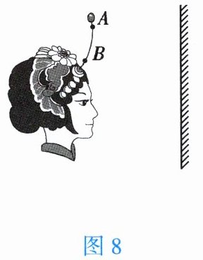 15. 如图 8 是某戏曲演员在平面镜前化装的情景。请在图中画出演员头饰中弧线 AB 段在平面镜中的像,并画出演员通过平面镜看见头饰上 A 点的光路图。