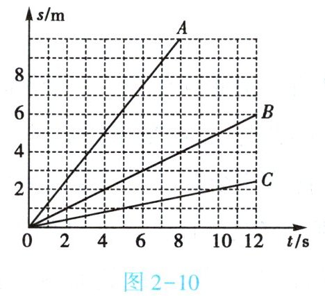 11. ($★★$)(双选)甲、乙两物体同时同地同方向开始做匀速直线运动,甲的速度大于乙的速度,它们的$s-t$图像为如图2-10所示的$A$、$B$、$C$三条直线中的两条,运动5s时甲、乙间的距离大于2m,则【
