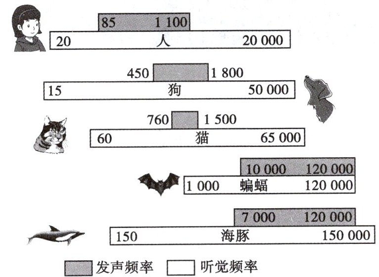 【解析】:根据题目提供的图表信息,地震产生的次声波频率一般低于20 Hz。人的听觉频率范围是20 Hz~20000 Hz,因此人不能听到次声波;狗的听觉频率范围是15 Hz~50000 Hz,因此狗能听到次声波;海豚的听觉频率范围是150 Hz~150000 Hz,因此海豚不能听到次声波。训练海豚时,海豚能听到的发声频率范围包含超声波(大于20000 Hz),所以可以用超声波进行训练。