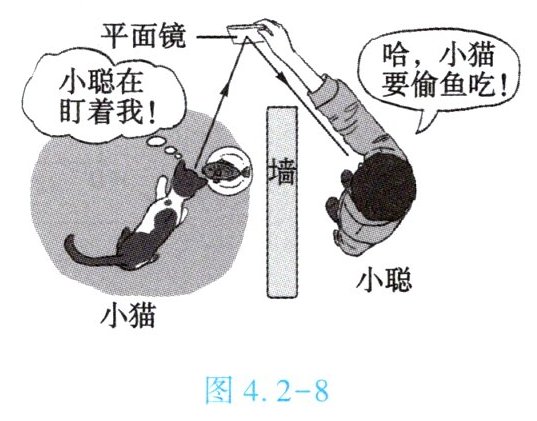 1. (★★)如图4.2-8所示是关于小猫和小聪的一幅漫画,图中两条光线的夹角是60°,那么,小聪观察小猫的光路的入射角大小是