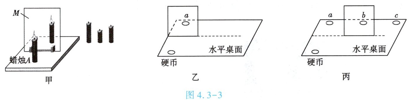 。(3) 如图 4.3 - 3 乙所示,将一枚硬币放在竖直的平面镜前,硬币的像在 $ a $ 处;将平面镜平移至图 4.3 - 3 丙所示的位置时,硬币的成像情况是