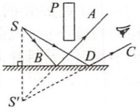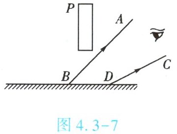 4. (★★★)如图 4.3 - 7 所示,平面镜上方有一竖直挡板 $ P $,在 $ AB $ 和 $ CD $ 之间的区域内可以看见挡板左侧的一个发光点 $ S $ 在平面镜中的像。请你利用平面镜成像特点,作图找出挡板左侧这个发光点的位置。