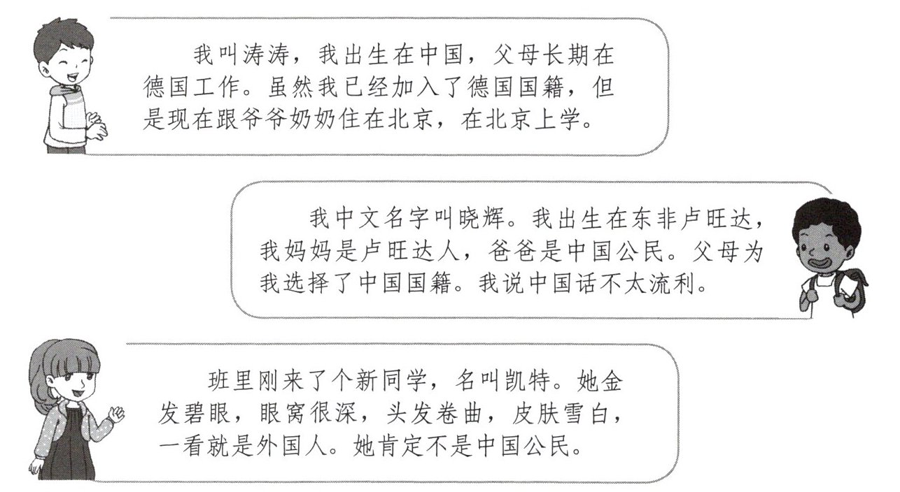 班里刚来了个新同学,名叫凯特。她金发碧眼,眼窝很深,头发卷曲,皮肤雪白,一看就是外国人。她肯定不是中国公民。