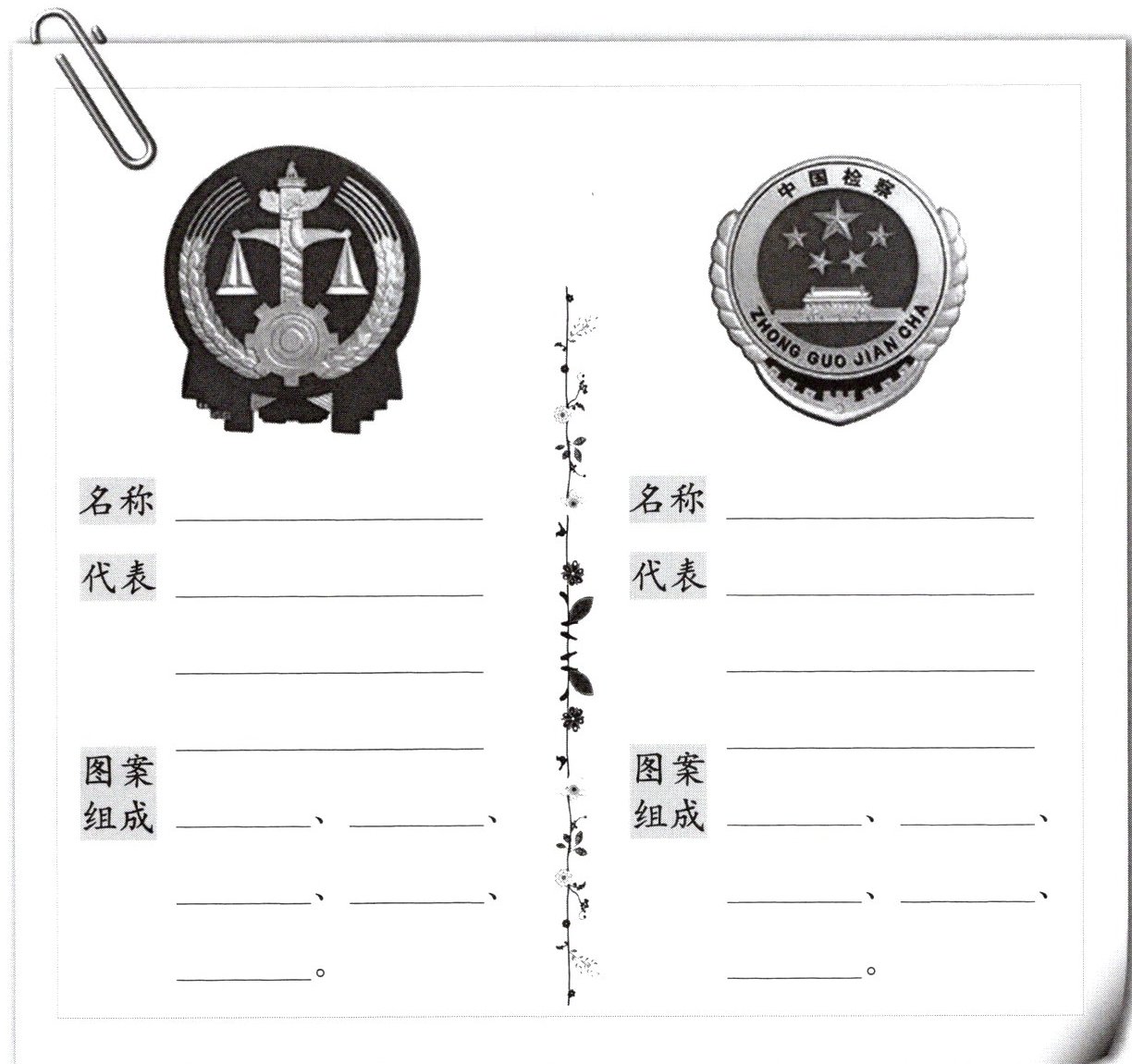 左:法徽;人民法院、法官;麦穗;齿轮;华表;天平;绶带。