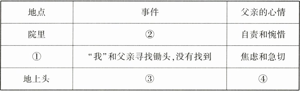 14.①路上、地边、塄坎上 ②父亲发现把锄头忘地里了 ③我们找到了锄头 ④兴奋和激动