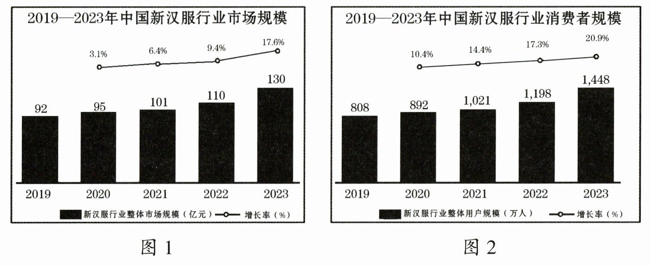 示例:可行。图表上新汉服行业市场规模和消费者规模都呈稳步增长趋势,说明“新中式”穿搭已经被越来越多的消费者喜爱,也促进了相关企业的发展。