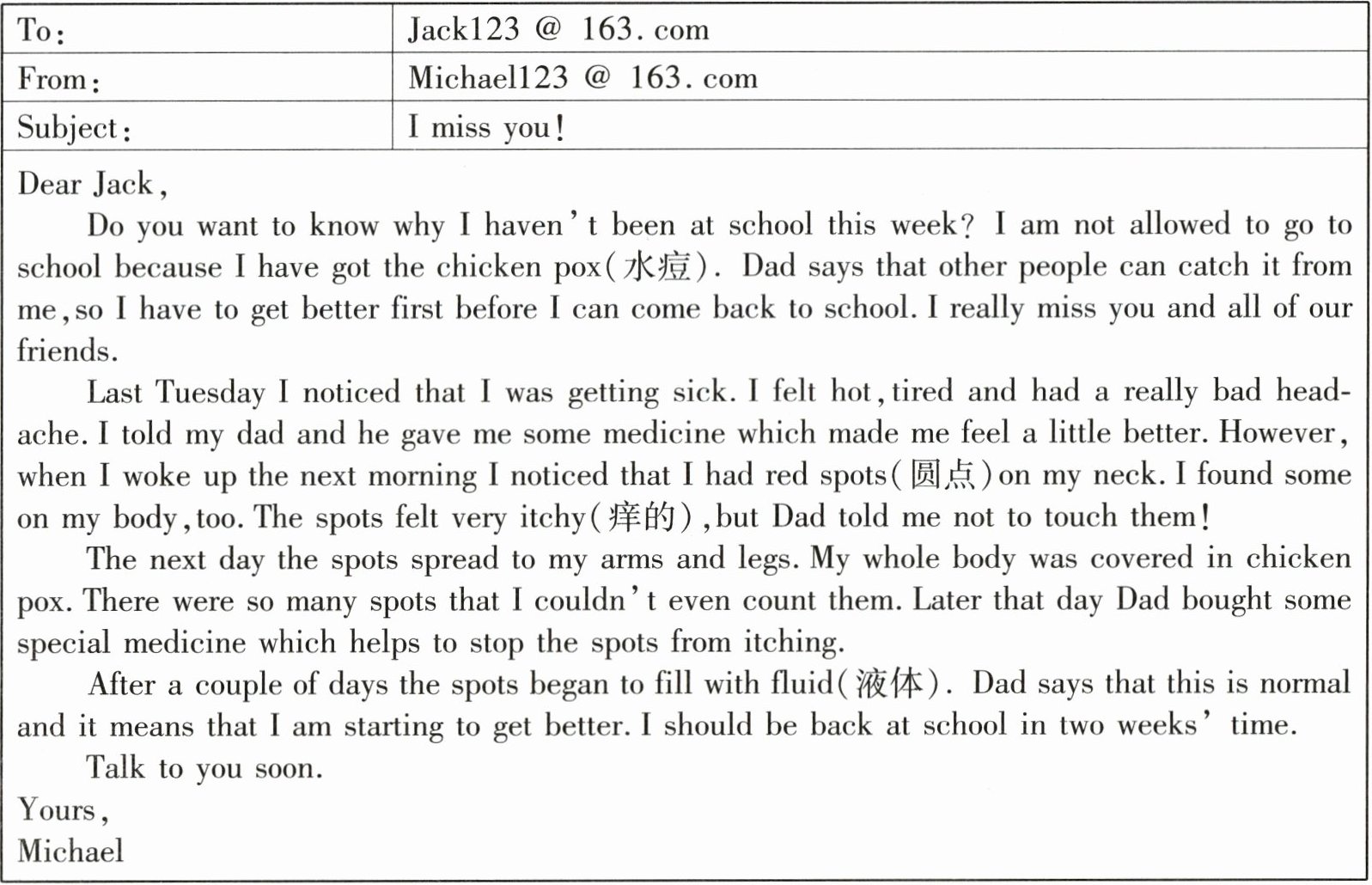 )6. Michael wrote this email ______.A. at school B. at home C. in the hospital D. in the library