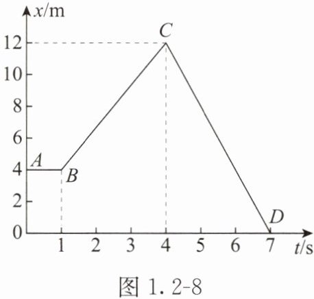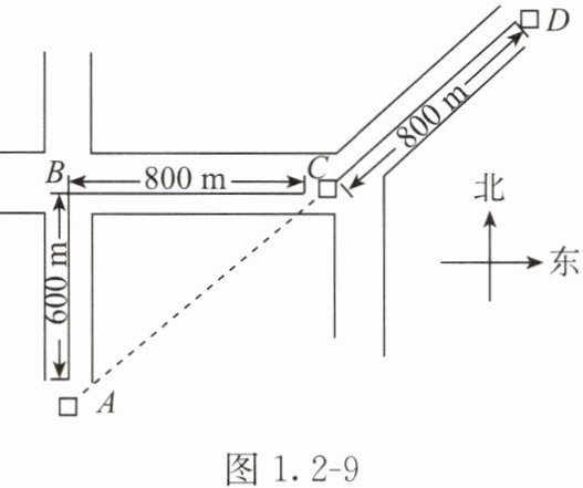 3. 如图1.2-9所示,一辆汽车沿着马路由$A$出发经$B$、$C$到达$D$。$A$、$C$、$D$恰好在一条直线上。汽车行驶的路程是多少?位移又是多少?方向如何?