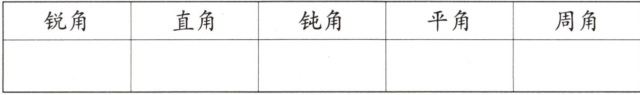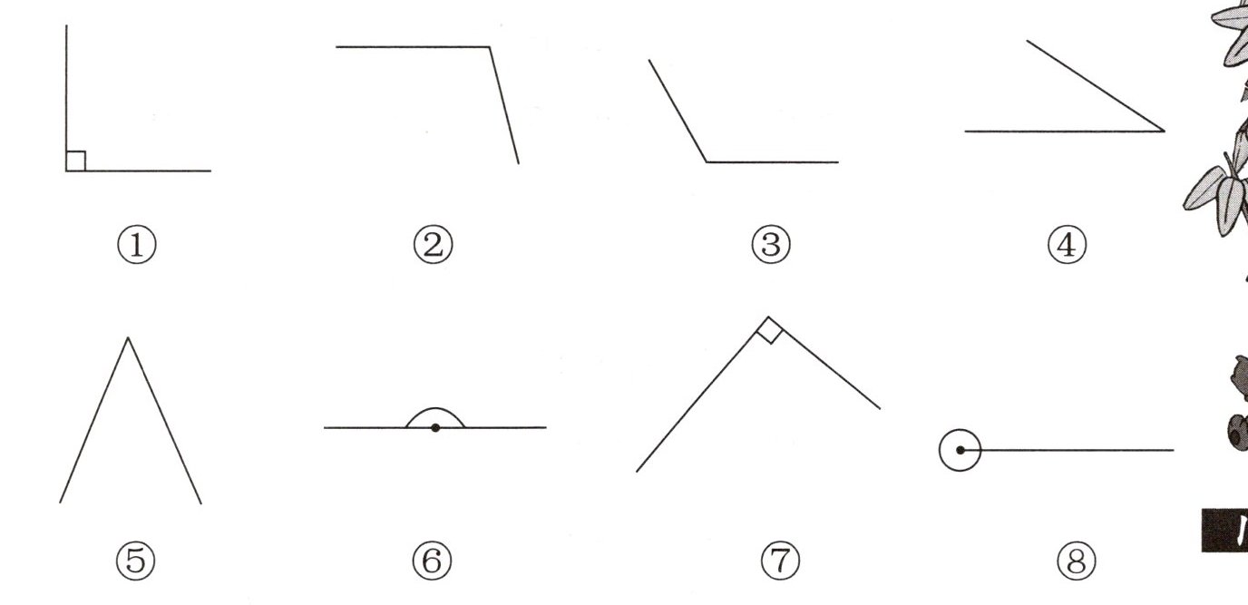 锐角:④⑤;直角:①⑦;钝角:②③;平角:⑥;周角:⑧