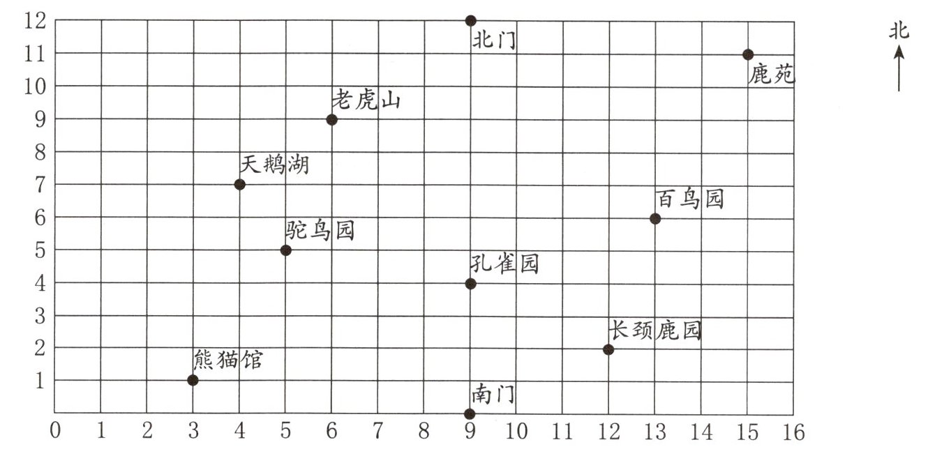 (1)百鸟园在南门的东北方向,百鸟园的位置用数对表示为$(13,6)$。