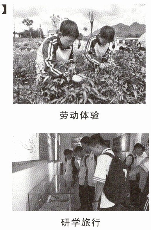 解析:本题考查亲社会行为的养成。图片中提供的信息是“劳动体验”和“研学旅行”,这说明亲社会行为在人际交往和社会实践中养成。在此基础上,结合自己参加过的社会实践活动,运用所学知识,答出养成亲社会行为的具体做法即可。