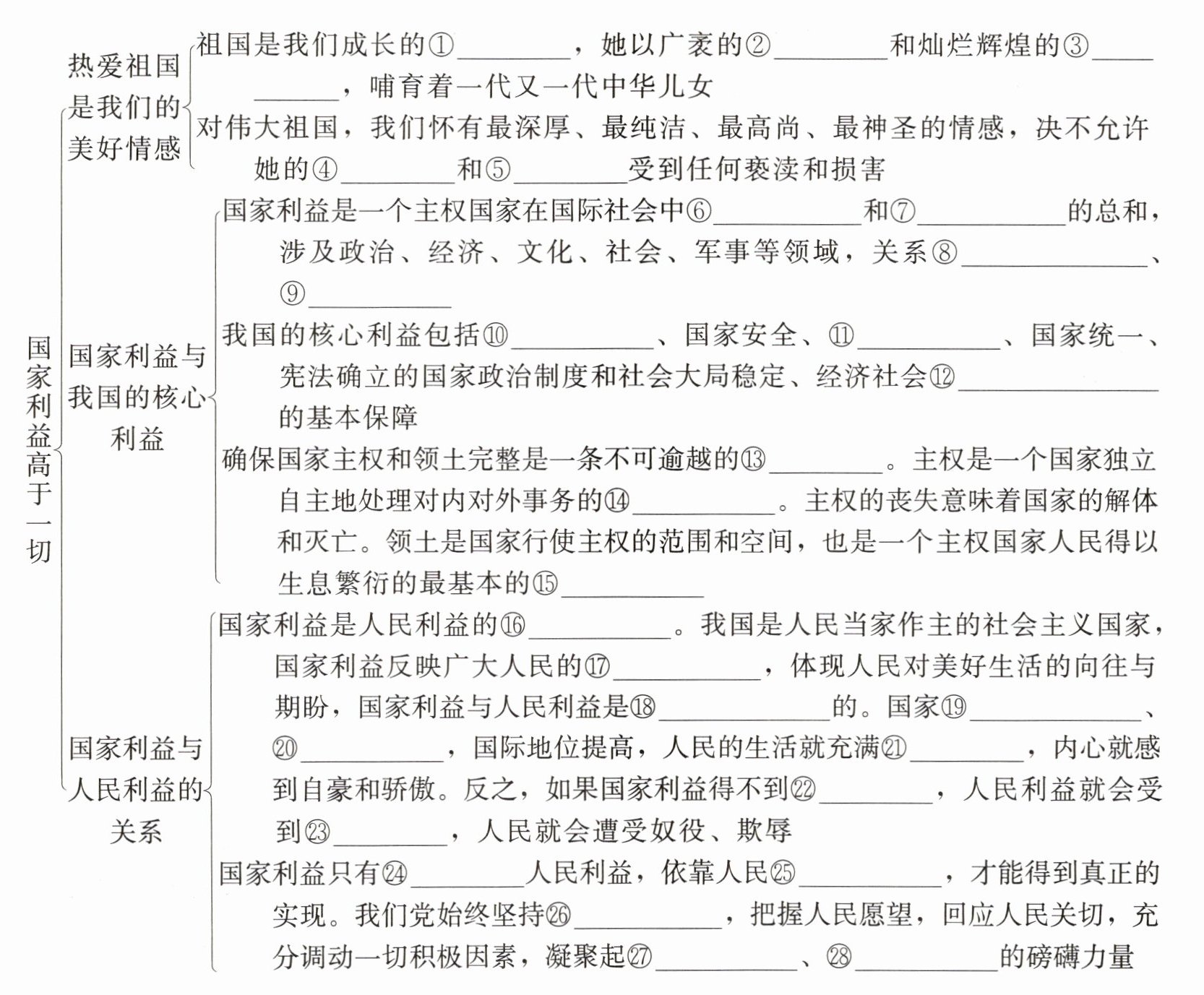 ①摇篮 ②土地 ③思想文化 ④荣誉 ⑤利益 ⑥生存需求 ⑦发展需求 ⑧民族生存 ⑨国家兴亡 ⑩国家主权 ⑪领土完整 ⑫可持续发展 ⑬红线 ⑭最高权力 ⑮物质基础 ⑯集中体现 ⑰共同需求 ⑱高度统一 ⑲独立自主 ⑳繁荣富强 ㉑希望 ㉒维护 ㉓损害 ㉔反映 ㉕艰苦奋斗 ㉖人民至上 ㉗强国建设 ㉘民族复兴