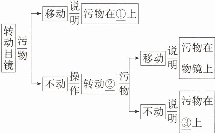 9. 使用显微镜时,视野中常有“污物”出现。为快速判断“污物”可能存在的位置,某同学画出了如下图所示的思维导图,请补充完整。