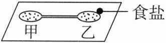 10. 如图,载玻片上滴有甲、乙两滴草履虫培养液,用解剖针连通两滴培养液,并在乙的右侧放一小粒食盐。请你利用生物能对外界刺激作出反应的原理,推测草履虫将(