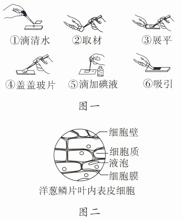 10. (四川泸州中考)图一表示小丽制作洋葱鳞片叶内表皮细胞临时装片的过程,图二是她在显微镜下观察并绘制的图形,请据图回答下列问题: