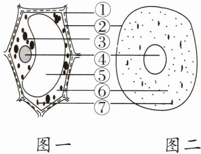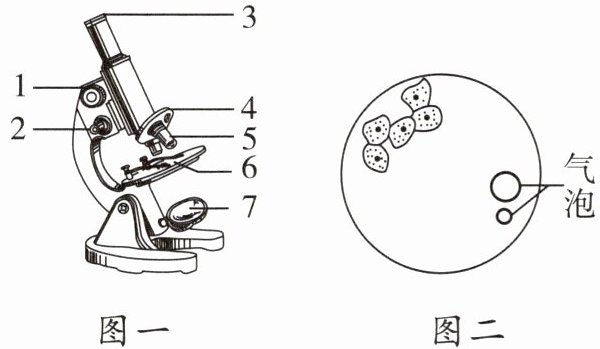 5. 图一为单目显微镜结构示意图,图二表示人口腔上皮细胞临时装片观察视野。请回答问题([ ]内填数字):