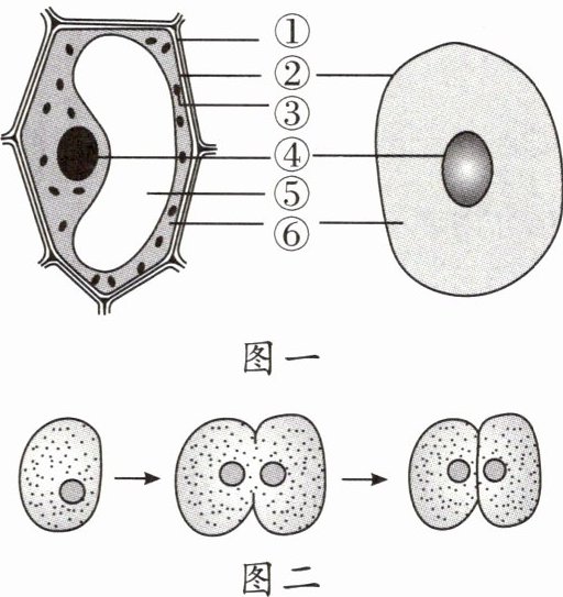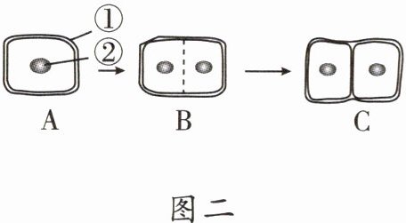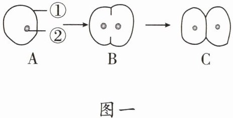 (3)图一C过程为细胞中央部分的细胞膜从四周逐渐地向内凹陷,使细胞质一分为二,每部分细胞质中含有一个细胞核;图二C过程为在两个新细胞核之间的细胞质中央形成新的细胞膜,并产生新的细胞壁,从而使一个植物细胞分裂成为两个新细胞