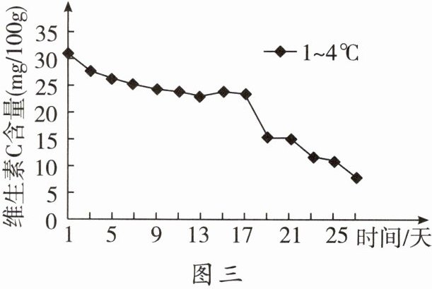 (4)研究人员测定在1~4℃条件下贮藏白菜时维生素C含量随时间的推移而变化的实验,结果如图三: