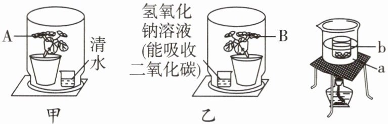 ①将甲、乙两装置(如下图)暗处理两天;②将两装置移至光下两小时;③摘取叶片A、B进行水浴加热;④漂洗叶片后滴加碘液。