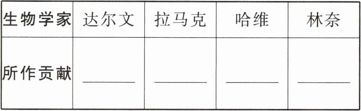 7. 将下列生物学家所作出的贡献的正确序号填入表格中相应的横线上。