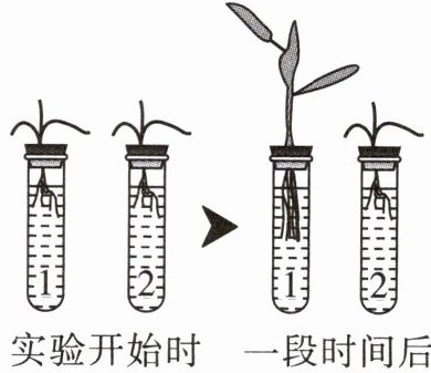 4. 将两株生长情况基本相同的玉米苗,分别放在盛有等量蒸馏水和土壤浸出液的玻璃器皿中进行培养,结果如下图所示(1号加入土壤浸出液,2号加入蒸馏水)。对此分析正确的是(