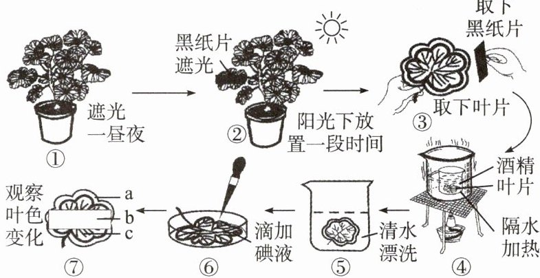 。③步骤⑦中叶片c处变蓝,请解释叶片c处变蓝的原因: