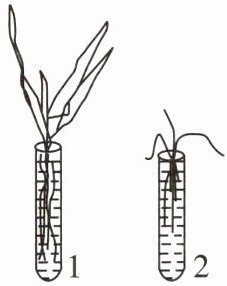 (1)用1、2号两支试管(1号试管盛有土壤浸出液,2号试管盛有蒸馏水)各培养一株生长状况基本相同的健壮玉米幼苗。一段时间后,观察两株幼苗的生长情况,结果如图: