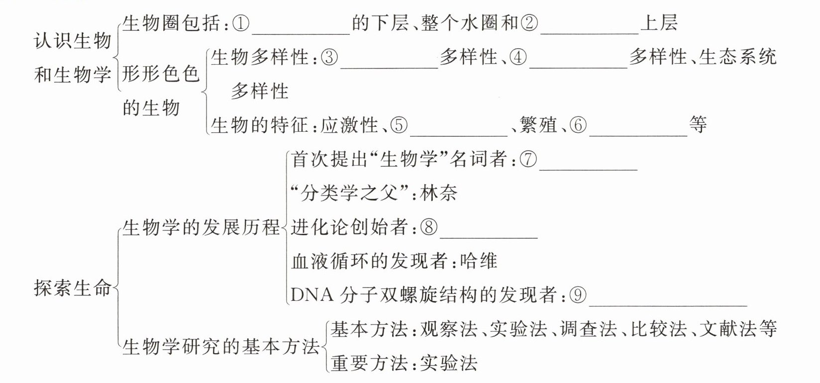 ①大气圈 ②岩石圈 ③物种 ④遗传 ⑤生长 ⑥新陈代谢(可与⑤互换) ⑦拉马克 ⑧达尔文 ⑨沃森和克里克