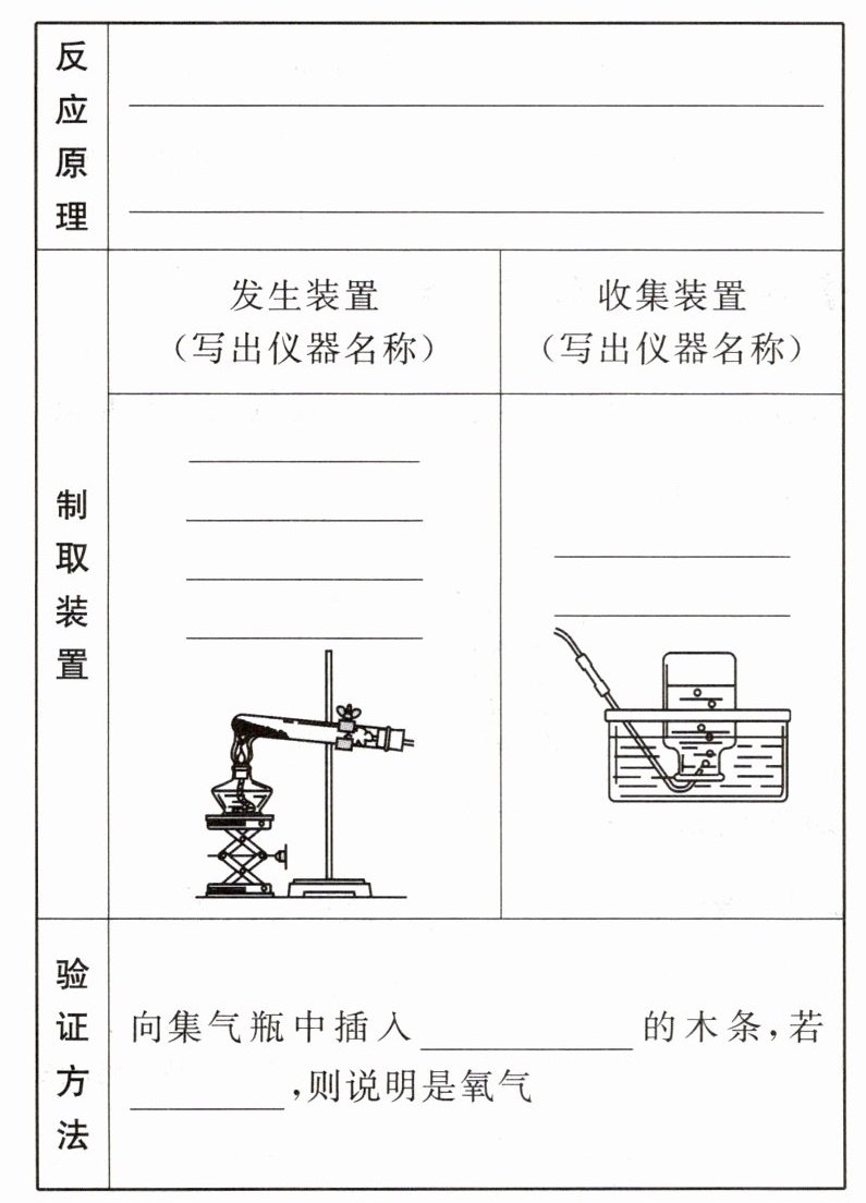 高锰酸钾$\xrightarrow{加热}$锰酸钾+二氧化锰+氧气 过氧化氢$\xrightarrow{二氧化锰}$水+氧气 酒精灯 试管 铁架台 导管、橡胶塞 水槽 集气瓶 带火星复燃