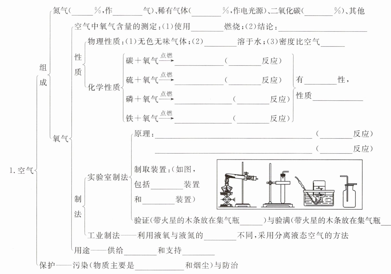 1.78 保护 0.94 0.03 红磷 约占空气体积的1/5 不易 大 二氧化碳 化合 二氧化硫 化合 五氧化二磷 化合 四氧化三铁 化合 氧化 比较活泼 高锰酸钾$\stackrel{加热}{\longrightarrow}$锰酸钾+二氧化锰+氧气 分解 过氧化氢 $\stackrel{二氧化锰}{\longrightarrow}$水+氧气 分解 发生 收集 口 沸点 呼吸 燃烧 有害气体 2.化学反应速率 质量 化学性质 3.同 不同
