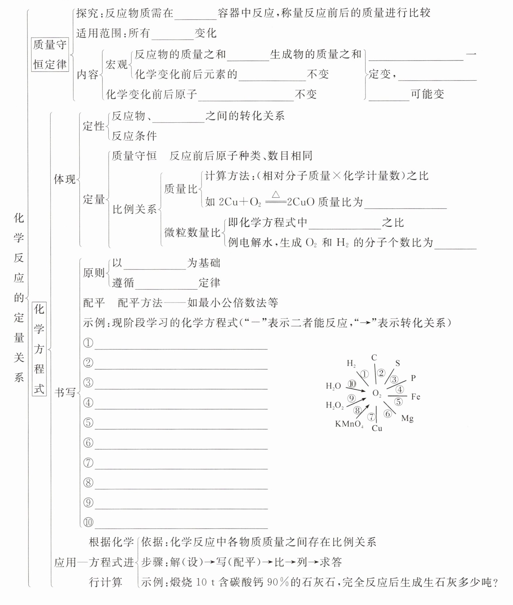 密闭 化学 等于 种类、质量 质量 物质、分子种类 元素化合价、分子数目 生成物 128∶32∶160 化学计量数 1∶2 客观事实 质量守恒 $2H_2 + O_2 \xlongequal{点燃} 2H_2O$ $C + O_2 \xlongequal{点燃} CO_2$ $S + O_2 \xlongequal{点燃} SO_2$ $4P + 5O_2\xlongequal{点燃} 2P_2O_5$ $3Fe + 2O_2 \xlongequal{点燃} Fe_3O_4$ $2Mg + O_2 \xlongequal{点燃} 2MgO$ $2Cu + O_2 \xlongequal{\triangle} 2CuO$ $2KMnO_4 \xlongequal{\triangle} K_2MnO_4 + MnO_2 + O_2 \uparrow$ $2H_2O_2 \xlongequal{MnO_2} 2H_2O + O_2 \uparrow$ $2H_2O \xlongequal{通电} 2H_2 \uparrow + O_2 \uparrow$