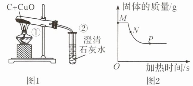 7. 按图1进行木炭还原氧化铜的实验,实验时①中固体的质量随加热时间的变化如图2所示。下列分析正确的是(
