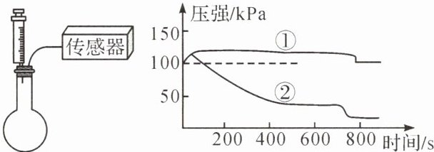 10. 在烧瓶中充满${CO_{2}}$,通过注射器向瓶中分别加入同体积的水和澄清石灰水,利用传感器得到的气压变化对应如图曲线①和②。下列说法错误的是(