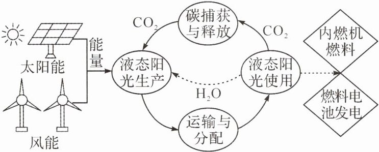 液态阳光,是指利用太阳能和风能等可再生能源,将二氧化碳和水转化为以甲醇为代表的液态燃料和有机化学品。它可以取代传统化石能源,实现二氧化碳的循环利用。液态阳光概念示意图如下。