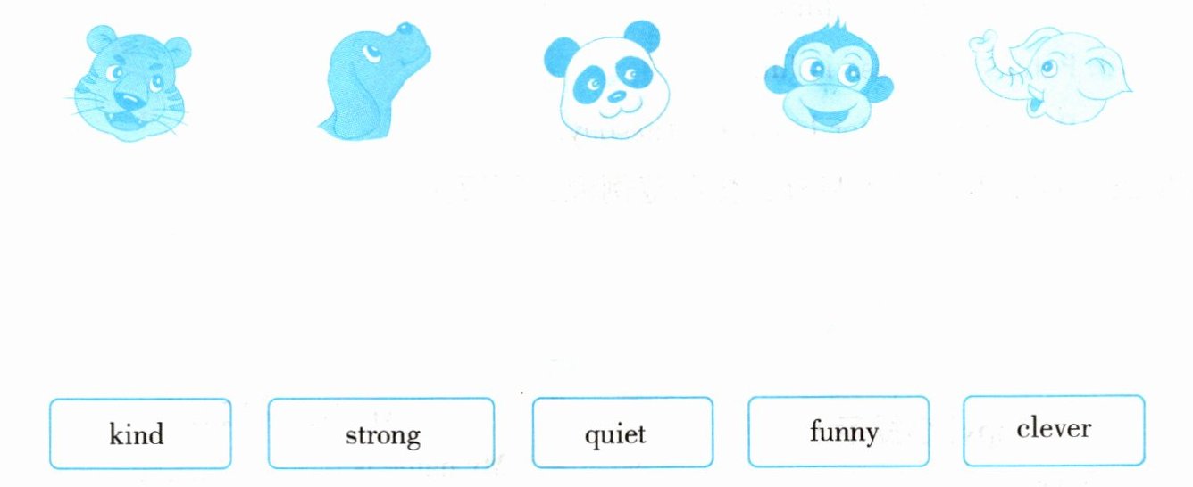 (注:实际答题时需根据听力内容连线,此处因缺少听力材料无法给出具体连线结果。请根据听到的形容词与动物特征匹配,例如:老虎-strong,熊猫-quiet,猴子-funny/clever,狗-kind,大象-kind/strong等,以听力原文为准。)