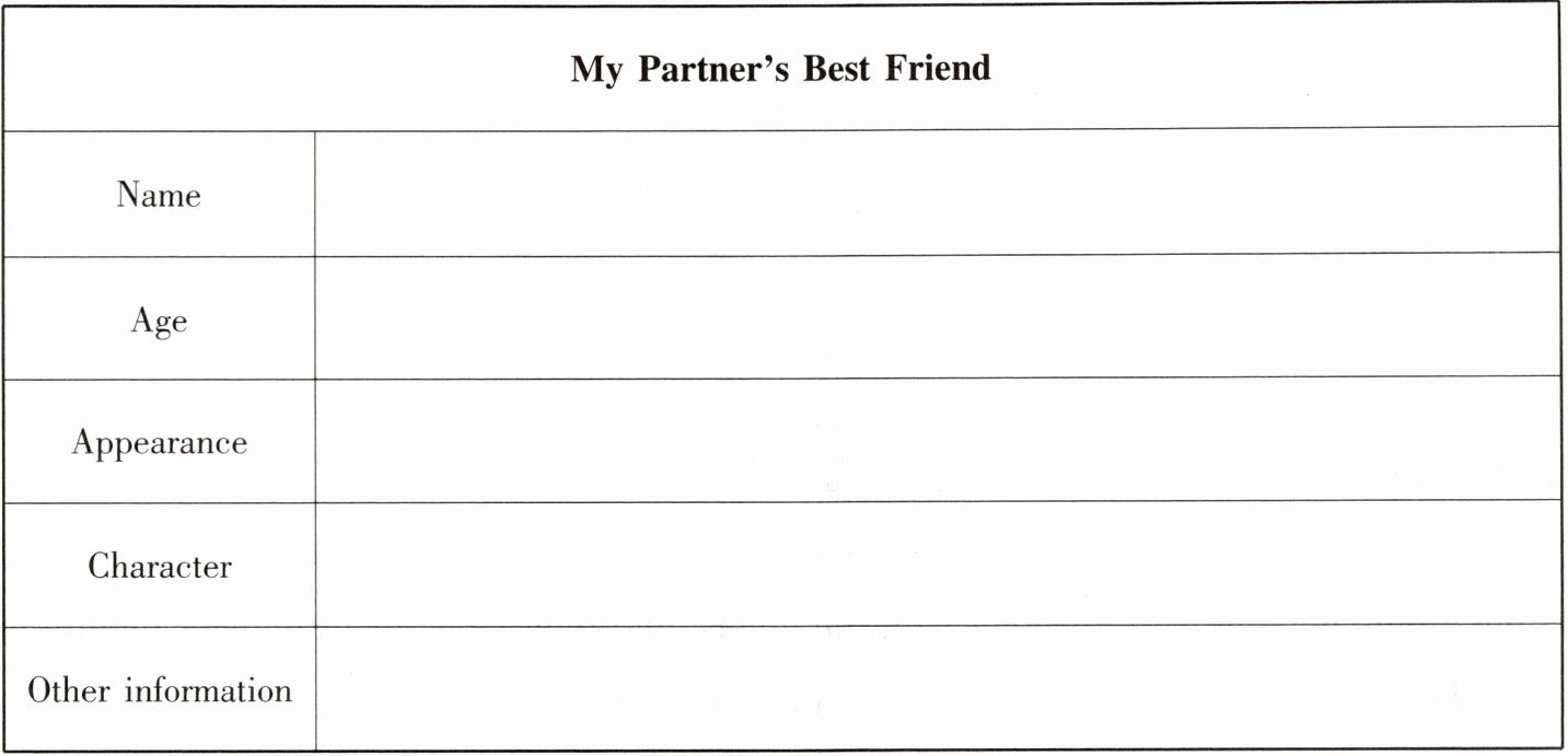 Group work. Divide the class into groups of 4 - 6. Each member interviews one group mate about his/her best friend. Finish the following chart, and then introduce your partner's best friend in the group or class. The listeners guess who he/she is.