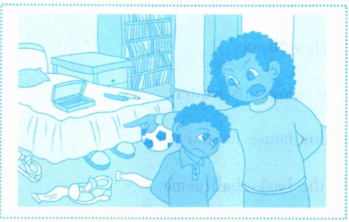 —Look, I'll do it now. Put my shoes behind the door. Put my football ____ the box. Put my shirt ______. Put my ____ in the washing machine. Put my pen in the ______. Put my pencil case in my bag and put my bag ______. Then I sweep the floor and empty the trash! Is it clean and tidy?