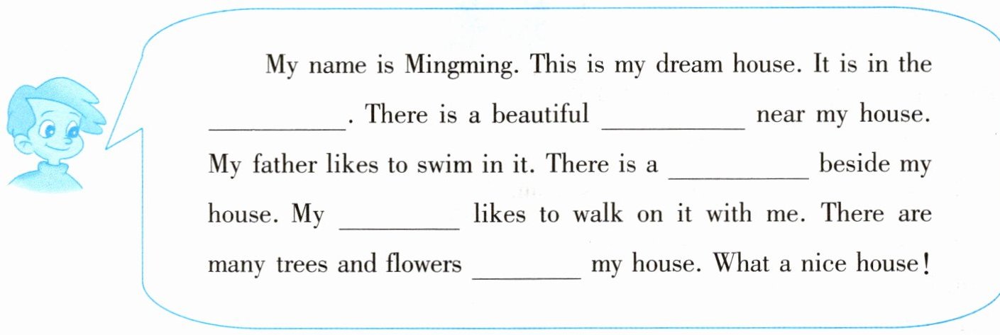 My name is Mingming. This is my dream house. It is in the ____. There is a beautiful ____ near my house. My father likes to swim in it. There is a ____ beside my house. My ____ likes to walk on it with me. There are many trees and flowers ____ my house. What a nice house!