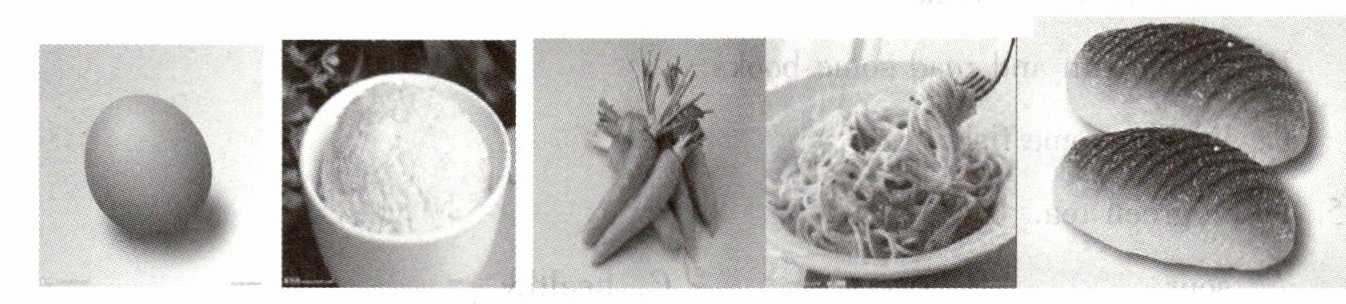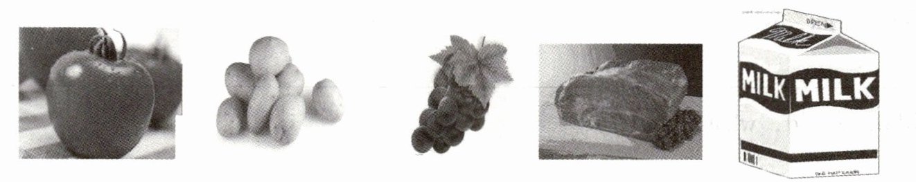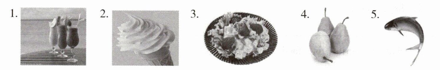 1. juice 2. ice cream 3. salad 4. pears 5. fish