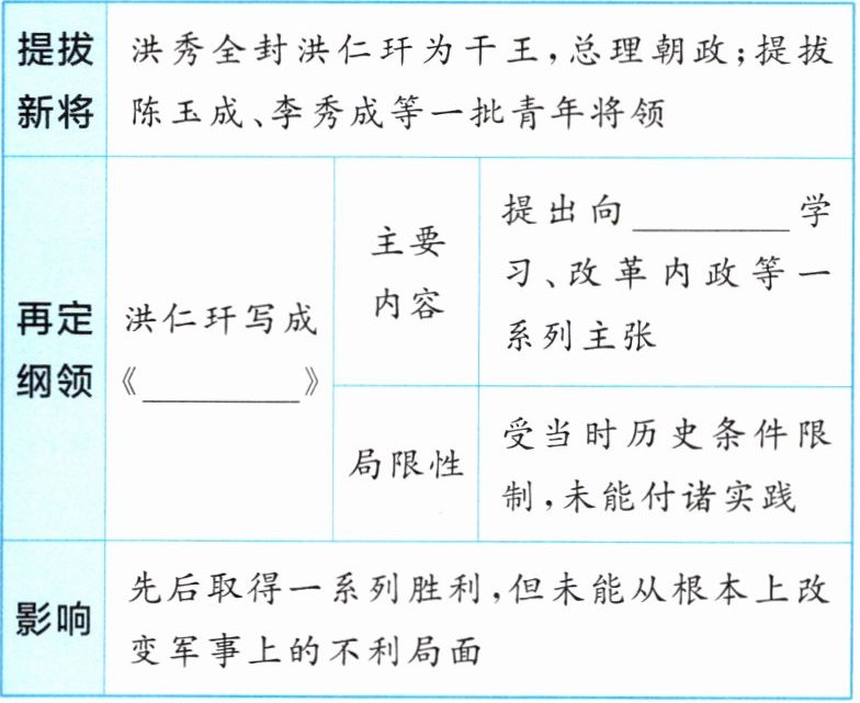 |再定纲领|洪仁玕写成《____》|主要内容|提出向____学习、改革内政等一系列主张|
