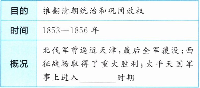 |概况|北伐军曾逼近天津,最后全军覆没;西征战场取得了重大胜利;太平天国军事上进入____时期|