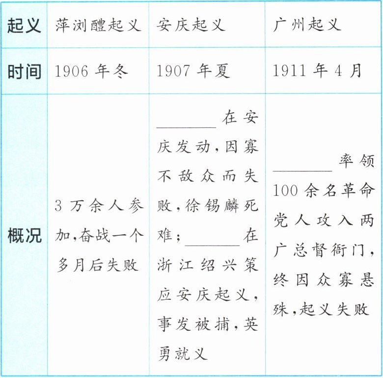 |概况|3万余人参加,奋战一个多月后失败|______在安庆发动,因寡不敌众而失败,徐锡麟死难;______在浙江绍兴策应安庆起义,事发被捕,英勇就义|______率领100余名革命党人攻入两广总督衙门,终因众寡悬殊,起义失败|