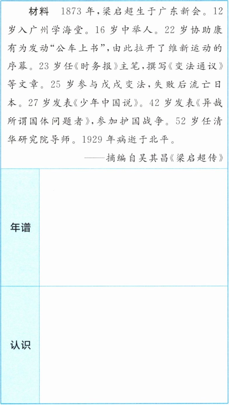 【示例】年谱:1873 年,生于广东新会。1895 年,协助康有为发动“公车上书”。1898 年,参与戊戌变法。1915 年,参加护国运动。1929 年,病逝于北平。(也可制作表格或年代轴) 认识:梁启超是中国近代著名的思想家、政治活动家、学者。他围绕救亡图存的时代主题,宣传维新思想,参与戊戌变法;积极参加护国战争,维护共和制度。虽然有资产阶级的历史局限性,但梁启超为国奋斗、追求进步的精神值得我们学习。