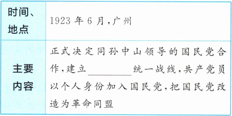 |主要内容|正式决定同孙中山领导的国民党合作,建立______统一战线,共产党员以个人身份加入国民党,把国民党改造为革命同盟|