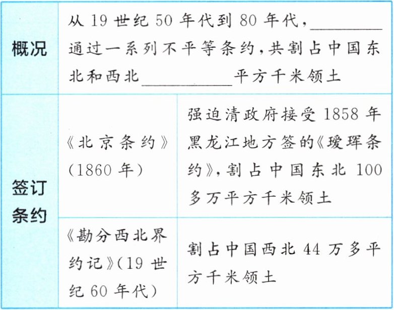 |概况|从 19 世纪 50 年代到 80 年代,______通过一系列不平等条约,共割占中国东北和西北______平方千米领土|
