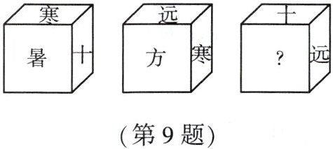 9. 《2023中国诗词大会》全新提炼了十大主题热词:欢喜、寻味、燃、寒暑、先生、本来、心动、天下、十年、远方,小铭选取“寒暑、十年、远方”三个主题词,将其写在一个正方体上,使得每个面上都有一个汉字,根据图中该正方体在三种状态所显示的汉字,可推出图中“?”的汉字是