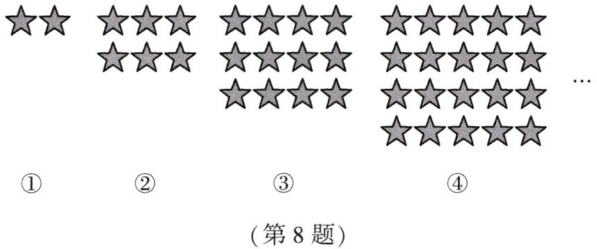 8. 如图,将形状大小完全相同的★按照一定的规律摆成下列图形,图①中★的个数为$a_{1}$,图②中★的个数为$a_{2}$,图③中★的个数为$a_{3}$……依此类推,第$n$幅图中★的个数为$a_{n}$,则$\dfrac{n}{a_{1}} + \dfrac{n}{a_{2}} + \dfrac{n}{a_{3}} + … + \dfrac{n}{a_{2023}}$的值为(
