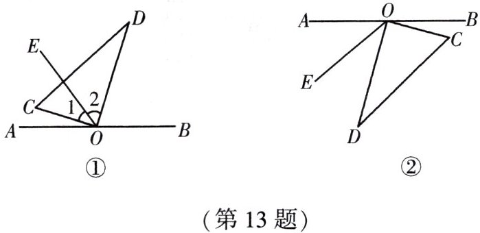 13. 如图①,直角三角板 $ COD $ 的直角顶点 $ O $ 在直线 $ AB $ 上,$ \angle COD = 90^{\circ} $,射线 $ OE $ 是 $ \angle AOD $ 的平分线。